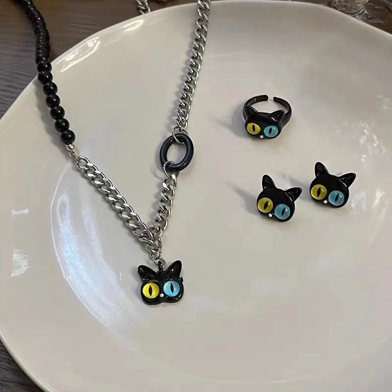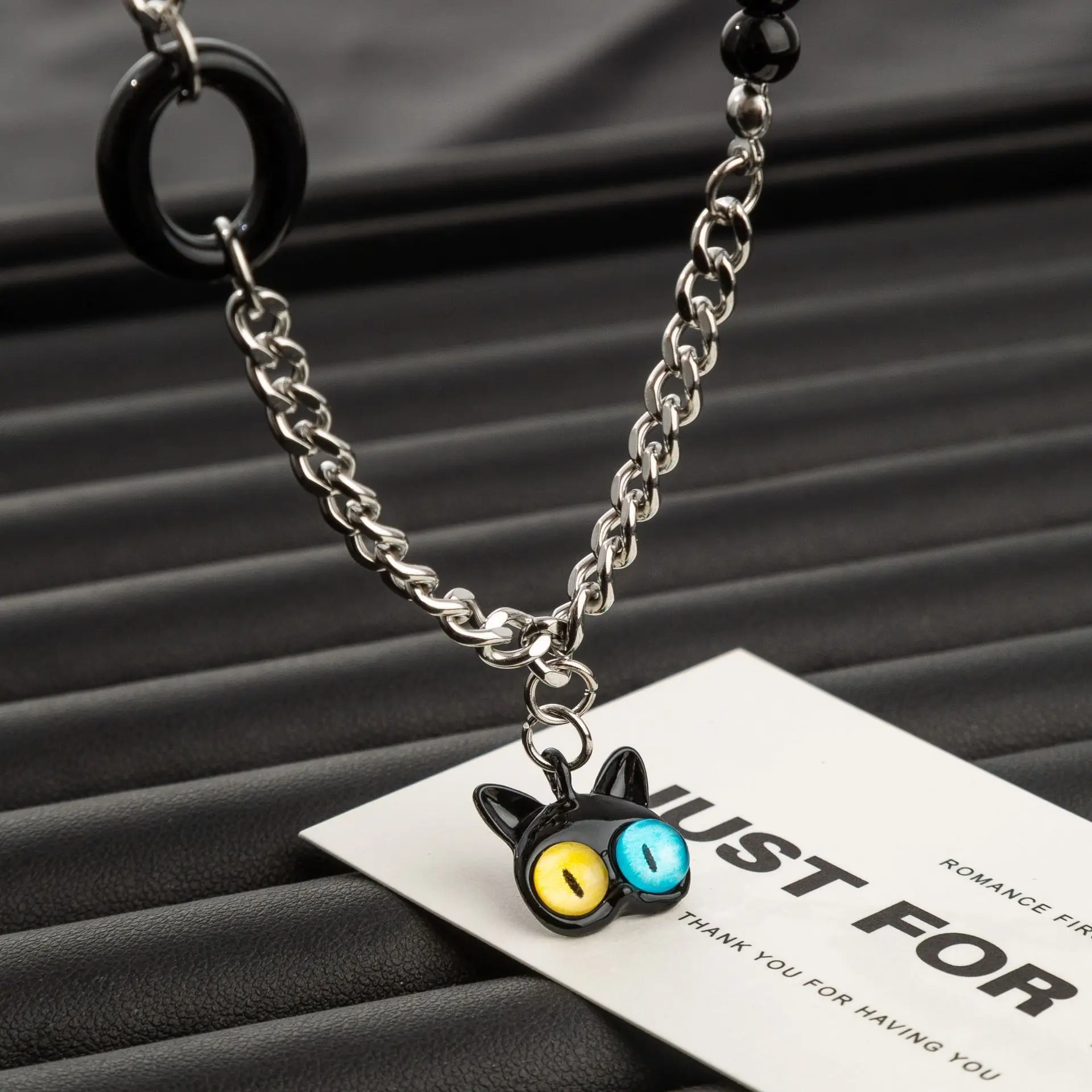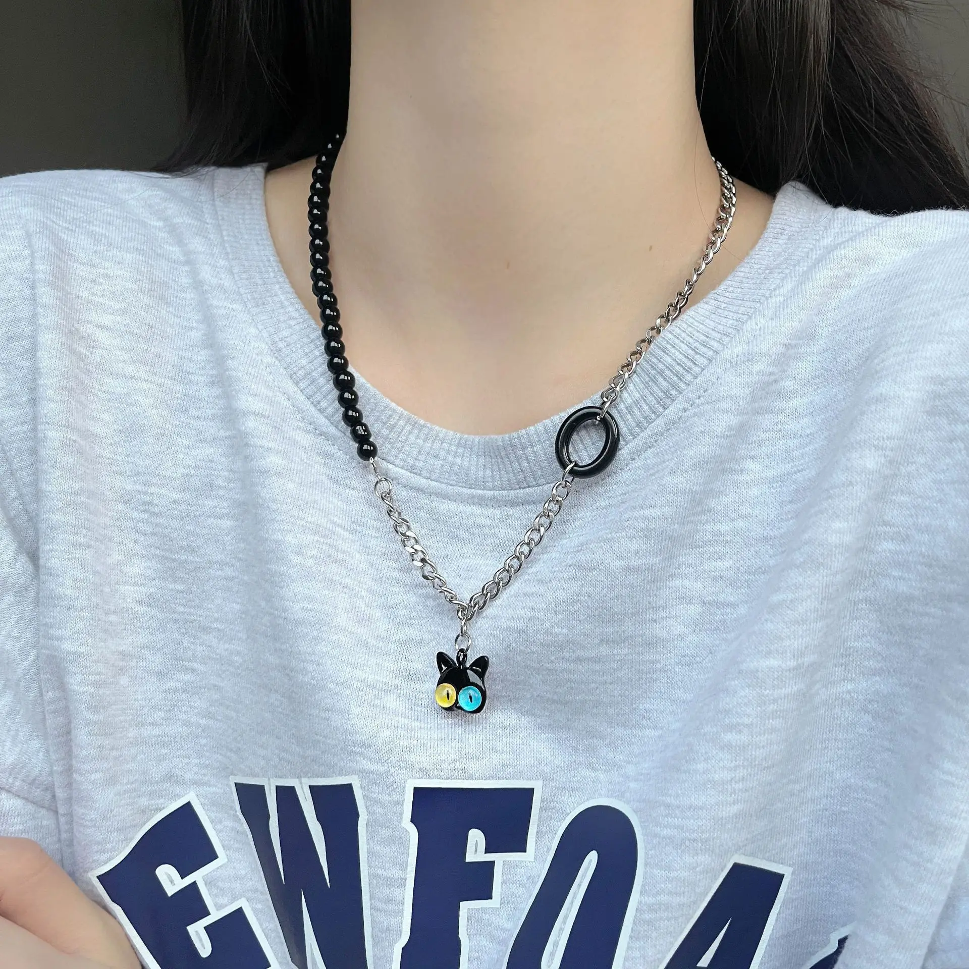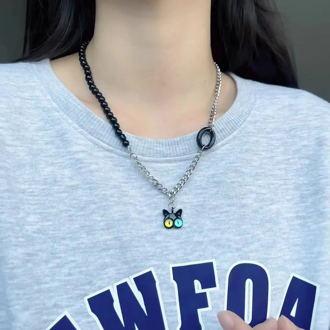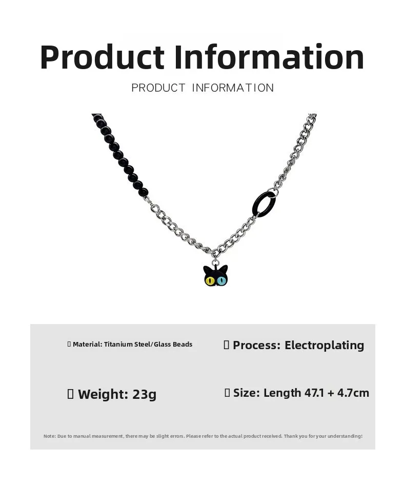 Elevate your style with this high-end black cat necklace, crafted from lightweight titanium steel for all-day comfort. Featuring a unique spliced design with black beads, silver chain links, and a playful cat pendant with mismatched eyes, it’s a bold statement piece. The fashionable lockbone chain and handcrafted freshwater pearls add elegance and versatility, making it perfect for casual outings or formal occasions. A must-have for fashion-forward women and cat lovers alike.