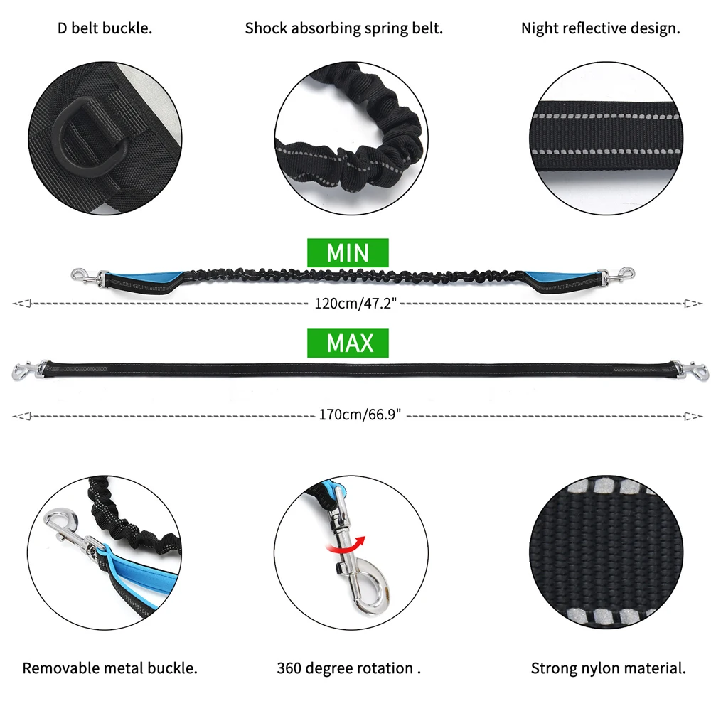 The shock‑absorbing bungee leash reduces sudden pulling, protecting your back and minimizing strain during fast movements. With an extendable length from 120cm to 170cm, your dog can run freely beside or ahead of you while staying safely connected.