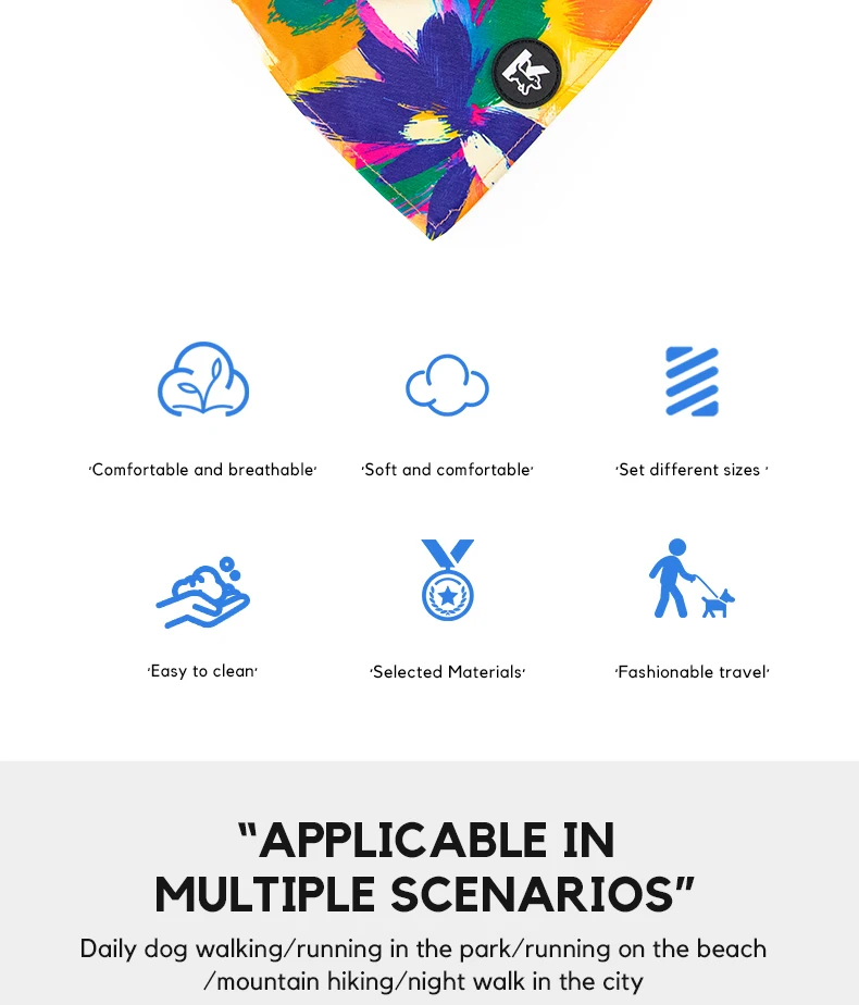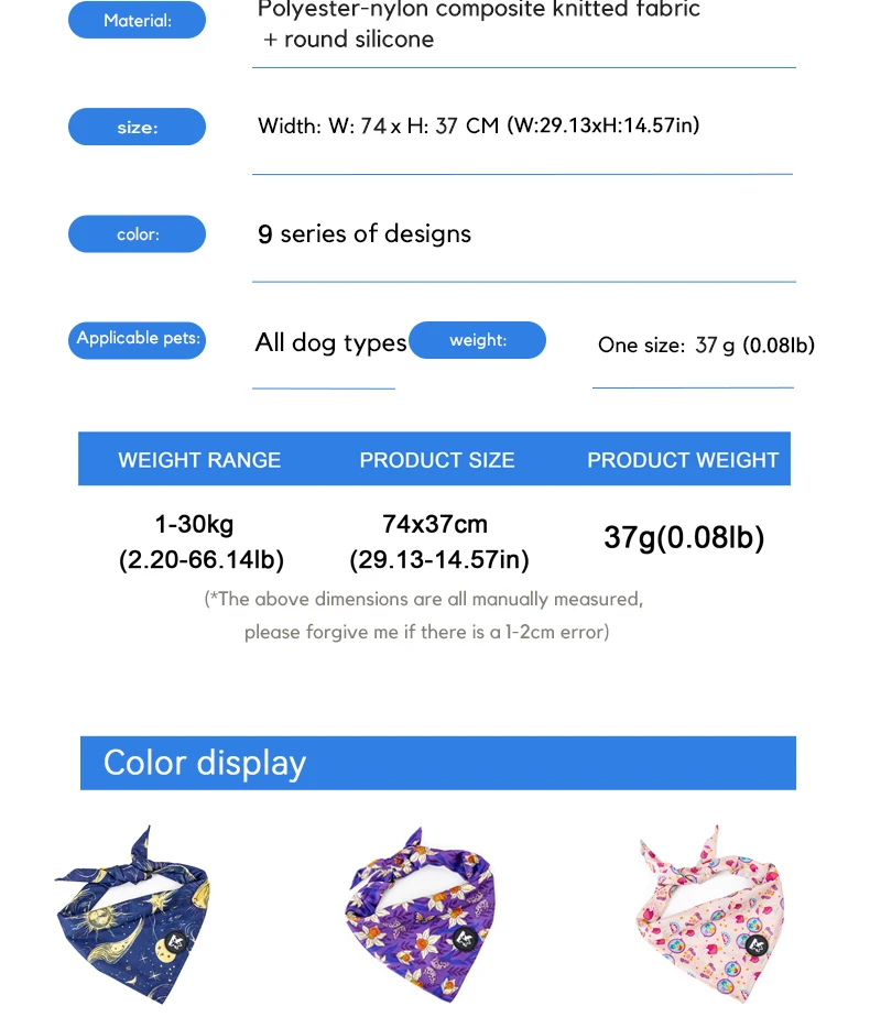 Product information Name: Pet bibsPolyester-nylon composite knitted fabric +round siliconeSize: 74*37cm(29.13-14.57 inches)Type: All dog typesWeight: 37g(0.08lb)Attention:The above...