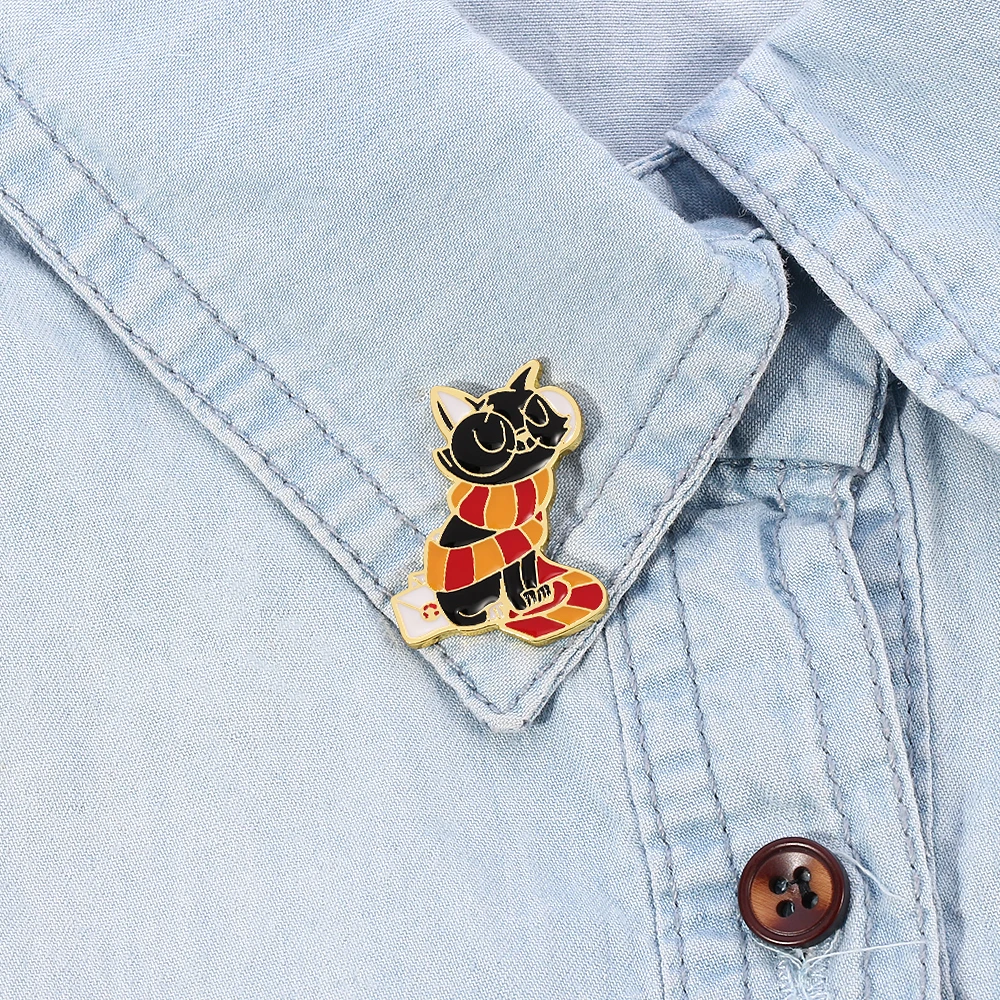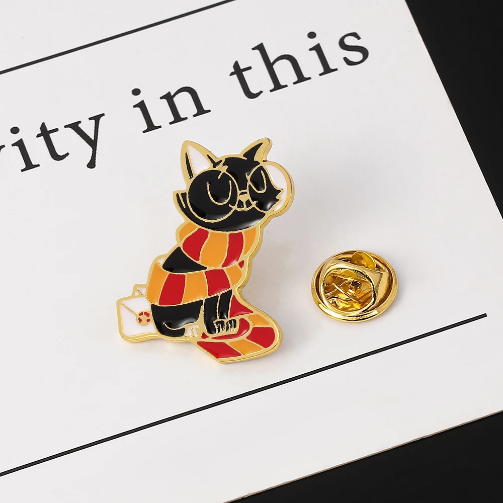 Add a touch of whimsy to your outfit or bag with this charming black cat enamel pin. Featuring a cozy red-and-yellow striped scarf and a tiny envelope with a paw print, this gold-trimmed accessory is perfect for cat lovers, pin collectors, and fans of magical or fantasy-themed designs. A stylish and playful gift for any occasion.
