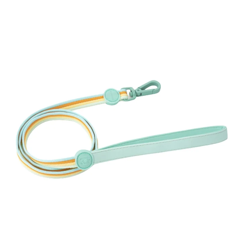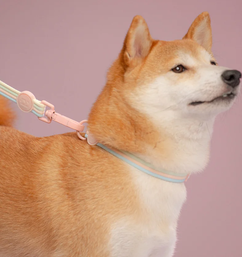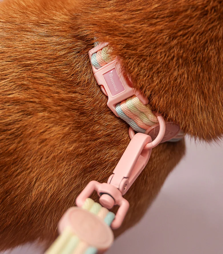 Add a touch of whimsical color to your pet's wardrobe with our Iridescent Color-Block Walking Set. This beautifully coordinated collection includes an adjustable harness vest, a matching collar, and a soft lead leash, all featuring a stunning pastel rainbow gradient that stands out in any setting.