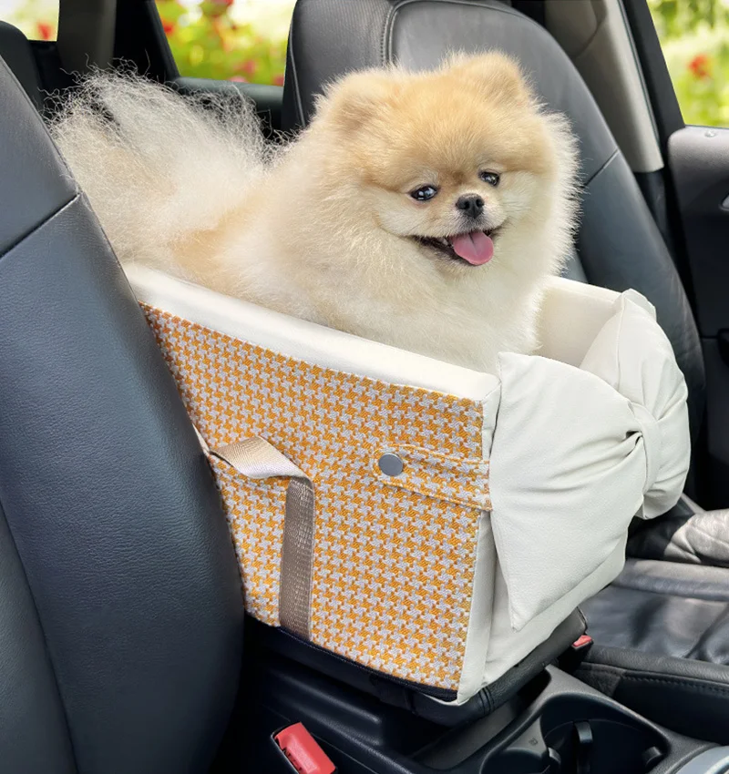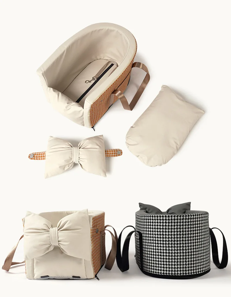 Featuring a soft padded interior, stable structure, and adorable bow detail, this car seat keeps your pet secure while adding a touch of charm to your vehicle. The elevated design helps reduce motion sickness, while the adjustable straps ensure a snug fit in the car’s central seat or passenger seat.