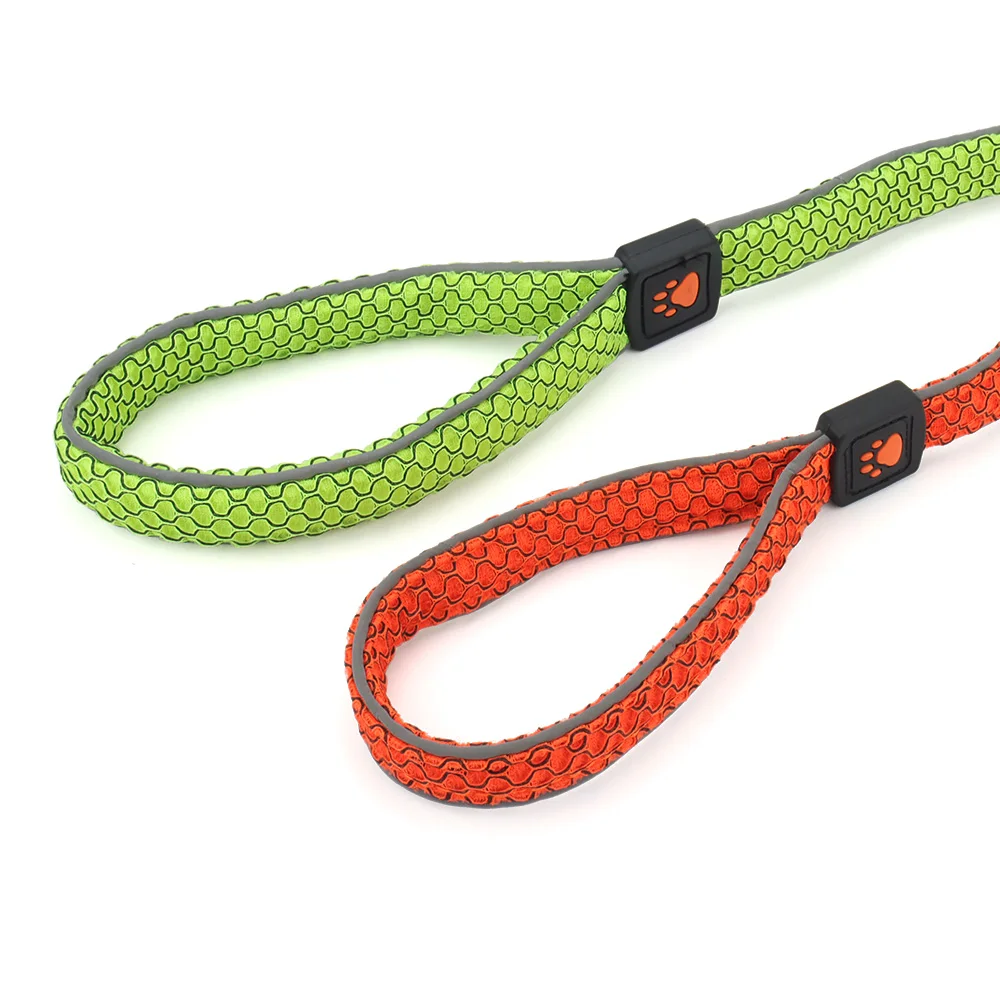 The matching collar and leash feature strong buckles, a secure metal clip, and a soft padded texture for comfortable handling. Available in Green and Orange.